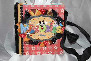 This scrapbook is a departure from my regular style, but was so fun to make! It has been about 6 years since we took the kids to Disney, but this scrapbook brought all of my memories rushing right back. Waiting in line for that one all important autograph, Space Mountain, and even the outdated, but classic, It's A Small World. I don't think that there is anything more magical for kids (and the parents that get to see the joy on their faces) than Disney World or Land. With this in mind, I put together an album that I would want to use myself. It's interactive, but not so much so that those little fingers that want to relive their precious memories would have trouble pulling out the inserts. I also put two memoribilia pockets on the inside front and back covers. These are perfect places to slip your tickets or any other momento's that you don't want to attach to pages. I also have made the inserts with a combination of vertical and horizontal picture placement. ALL of the embellisments have been attached so that you can slip your pictures underneath (I would recommend that you attach the embellishments completely after you add your pictures). I 'fussy cut' around some of the graphics on the adorable papers so that they wouldn't be covered up by your pictures, the pictures can be slipped underneath! That is always one of my pet peeves with beautiful papers...the design gets covered up once pictures are added and some of the beauty of the album gets lost...but not with this one!!